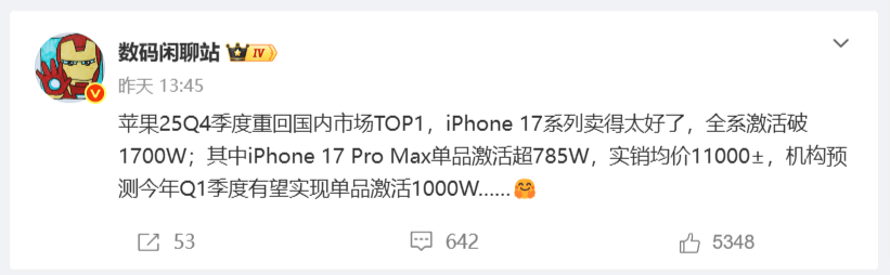 其中iPhone 17 Pro Max最受国内消费者欢迎,单品激活量超过785万台,在四款新机中的占比为46%左右,接近一半。