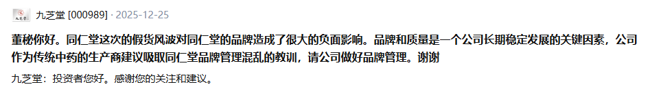 近日,有投资者在上市公司互动平台,直接援引同业“同仁堂假货风波”的教训进行留言:“品牌和质量是一个公司长期稳定发展的关键因素,建议吸取同仁堂品牌管理混乱的教训,请公司做好品牌管理。”公司董秘则对此回应:“感谢您的关注和建议。”